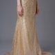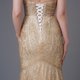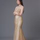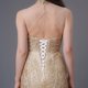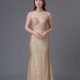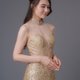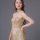 这款晚装旗袍无疑是您最重要日子的完美选择。它采用金色闪粉的网纱面料打造,搭配立领设计和后背系带,勾勒出迷人的鱼尾款剪裁。只需搭配精美首饰,即可完美诠释您动人的新娘风采。