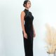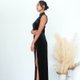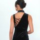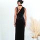 这款直身的Maleficent旗袍由光滑的丝绒制成,设有经典的中式企领、高开衩和水晶钮扣点缀,背部则有绑带细节,营造出华丽时尚的风格。搭配高跟鞋和钻石耳环,使整体造型更加完美。