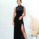 - 直身高衩丝绒旗袍,设有经典的中式企领、水晶钮扣点缀和背部绑带细节,营造出华丽时尚的风格。十分适合公司周年晚宴和鸡尾酒派对。