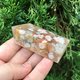 很漂亮的一根多彩柱子,这种七彩斑斓的樱花玛瑙是比较难得、克单价较高的品种,晶柱晶球的成品要到外全美是比较难的,成品体积越大、小瑕部位相对多些,特别是如果希望满花图案美丽的话,它的瑕疵部位就有可能更多。