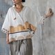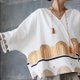 以 Hemp(大麻纤维)与有机棉混纺的天然质感布料,透过手工版画印刷(Block Print)精心制作而成的开襟衬衫。轻柔披上,能遮挡阳光,带来舒适的穿着体验。肩部加入褶襇设计,营造出蓬松的廓形。