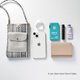 - “白缟”款式的手机斜背包,以洁净的白底搭配细腻的条纹织纹。 方便您随手取出手机,轻巧便利地出门, 简约的设计更能轻松搭配各种服装。 让您俐落地携带所需物品。