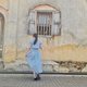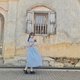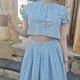 圆领短版上衣,蓝色,前开襟设计,公主袖。