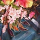 淡粉色郁金香与野花的溢出插花,背景为深蓝绿色和祖母绿。