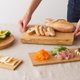 From a professional dealing with vessels, I received a request to ask for a plate of wood that eats bread and ham in a picnic scene.