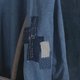 这件蓝色开襟外套一侧设计成补丁拼贴元素,