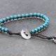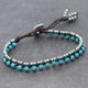This is hand woven bracelet made with dark brown color waxed cord weaved together with turquoise stone and brass silver beads . Closure using brass button