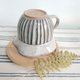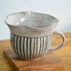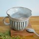 花花杯 以手拉坯成形,涂上化妆土呈现不同土色渐层,在以釉下彩彩绘线条并上透明釉高温烧制。 材质:陶 尺寸:最大直径11*高8.5(厘米),容量200 c.c. 烧成温度:1230度C 成形方式:手拉坯