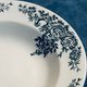 典雅的法国餐盘由着名的H. Boulenger & Cie公司于法国的Choisy-le-Roi地区制作,材质是Terre de Fer(铁胎陶瓷),这种材质比一般陶器更坚固,其风格为路易十五(Louis XV)风格,属于洛可可艺术的延伸,精致的单色印花装饰,主体为奶油白色的盘面,边缘饰以浓郁的深绿色花卉和蔓藤纹路,呈现经典的洛可卡尔纹样,展现了法国古典主义的优雅与浪漫。