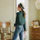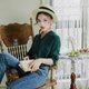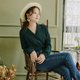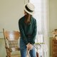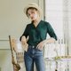 - 气质的西装翻驳领,形成V型领口,显瘦又凸显锁骨,墨绿色上身非常显白,木质纹理扣子给衣服增添文艺感