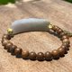 貔貅手牌为天然翡翠(糯豆种),长40mm,宽13mm,厚8.6mm,内侧做成符合手腕的弧形,刚上手会感觉冰凉,佩戴之后会贴手舒适。其余的金色配件为合金材质。线材使用日本水晶绳,稍有弹性,但仍须避免大力拉扯喔。
