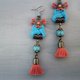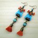 Gypsy boho earrings festival jewelry in turquoise and orange, made out of braided t-shirt yarn in blue turquoise color, adorned with faceted turquoise gemstone beads, antique bronze tone metal elements and burnt orange cotton tassels with barrel cap ends. Fish hook ear wires with clear silicone back stoppers.