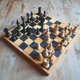 由木头制成。国王和王后的尖顶由木头制成。女王所戴的原创帽子。木头制成的骑士。 板 30x30 厘米,电池 3.5 厘米。 国王 7 厘米,兵 3.5 厘米。 重量 460 克。