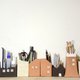 手工盖陶屋,营造屋龄老旧的感觉,可当成花器、放置文具,或纯粹当作摆饰品。保留陶土本色,只有局部上釉,排水性佳,若作为花器,可保持透气性。