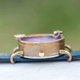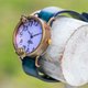 这是一款嵌配有浅紫水晶色的彩色玻璃的青蛙凝望着美丽莲花的手表。