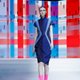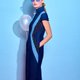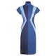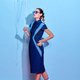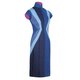 这件长衫由不同色度的靛蓝天丝®莱赛尔(Tencel® Lyocell) 纤维和良好棉花发展协会棉花相拼接,图案通过激光工艺形成,十分独特,且凹凸有致,凸显身体线条,同时借由视错觉的原理营造一种蜂腰的效果。