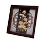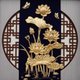 展现了自然的纯粹与内心的宁静。作品背景深蓝色的布料衬托出金箔的光泽,形成强烈的视觉对比。整体设计融合了传统中华元素,如背景圆形窗花木质框架和精致的花卉图案,象征着繁荣和祝福。