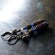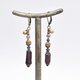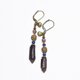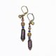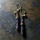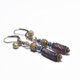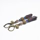 这是一款将紫色罗马玻璃、圆珠黄铜、蓝色古董珠、萤石与民族风铃铛串联而成的不对称耳环。