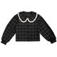 - 黑灰格紋面料,紋路清晰,緊密有質感 木耳花邊娃娃領+愛心排扣點綴,給人一種溫柔甜美的感覺 恰到好處的燈籠袖,凸顯手臂自然纖細 搭配格紋百褶裙,複古氣質少女感,一衣兩穿,襯衣or外套