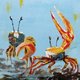 画家以鲜明的笔触与鲜艳的色彩,细腻地描绘出招潮蟹的细节,捕捉它们在自然中的悠闲瞬间。蓝天的背景与螃蟹的橙黄形成强烈对比,给予观者一种平静而又充满活力的感受。