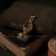 作品尺寸小巧可爱,繁复的装饰细节让吊坠显得精雕细琢,饱满如复活节彩蛋的上半部以蕾丝般的圆弧线条及金珠妆点并镶有两枚使用衬箔的石榴石,浓郁的深紫色调与金黄的主体呈现出高贵华美的气息。