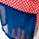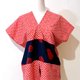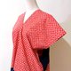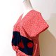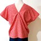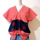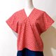 这块有点手绘漫画风的红底白点点布料,像是早些年绘图板还未开始普及,用沾水笔freehand画出的质感,看起来非常可爱,让人想起夏季的花火祭典,和心爱的人一起去逛庙会、捞金鱼,在花火开始之际,肩并肩看着美丽夜色的风情。不是每次都会穿着浴衣,因此想设计成有浴衣的感觉,却更能轻松穿着的形式。宽松的版型不挑身材,一面的腰际拼接海军蓝色块,像浴衣的腰带,另一面末端拼接半透明的海军蓝丝质混纺,若隐若现更有种微带性感的可爱风情。正面特别的小开衩可以打一个小小的结,拉高视觉,让上衣多点变化。只要搭配牛仔短裤、夹角木屐,就可以喀哒喀哒的和心爱的人牵手去逛庙会啰。