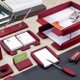 - 此文具组包含钉书机、桌垫、双笔座、便条盒、名片架、公文盒、笔筒、拆信刀、桌历以及回纹针盘