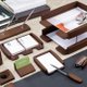 此文具组包含钉书机、桌垫、双笔座、便条盒、名片架、公文盒、笔筒、拆信刀、桌历以及回纹针盘