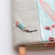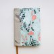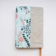 The front of this cover is made with an original design; a mint blue fabric of botanical sketches of organic florals and herbs. The cover is mostly machine-sewn with a pencil motif hand-embroidered on the corner. A little peephole is worked into the front of the book cover to store a pen/pencil, making it fuss-free travel writing / drawing kit.