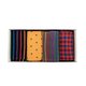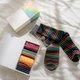 除了彩虹条纹的袜款之外,我们将红色与蓝色交错的格纹、橙黄色为大底的点点袜,