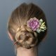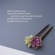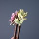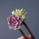 精致木质发簪,点缀着树脂黏土的多肉植物:粉红色的 Echeveria Perle von Nurnberg、Sedum Nussbaumerianum,以及浅绿色的 Crassula 嫩芽。