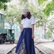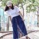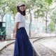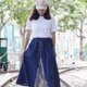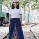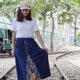 裙子是一直很受大家欢迎的A字裙型,穿起来显高显瘦。民族布配搭深蓝色棉麻布料,简约中带点活泼也很百搭。