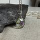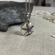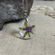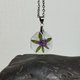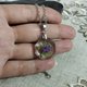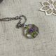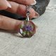 吊坠中央是干植物:粉红色花朵和绿色叶子。