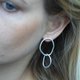 These earrings are made of 2 handmade oval loops, interlocking one to another. Loops are slightly irregular, following an organic oval shape.They were created from a square-profile 2 mm silver wire, in 95%silver, that was etched on the surface to give it a more handmade, artisan-crafted feel. The posts and stoppers are in sterling silver.