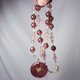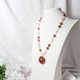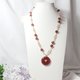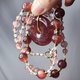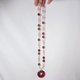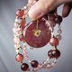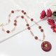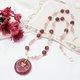 鸽血红草莓晶色正红、艳丽,磨制古钱(平安扣)饰,链身以星光(金点)草莓晶、净体草莓晶、蓝月光石设计,宝石色彩明艳、透水度高、金点闪耀,珠型与色调富韵律感,整体富贵亮丽、古典优雅。