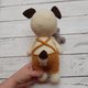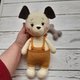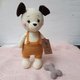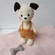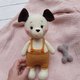 带骨头的狗玩具。手工钩编的有趣的狗是一个毛绒玩具。