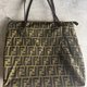这款 Fendi 手袋采用品牌经典的 Zucca 图案尼龙布料制成,呈现深棕与黑色相间的经典格纹设计,兼具高辨识度与复古魅力。手袋以托特包造型呈现,配有两条黑色皮革手柄,握感舒适,适合手提或肩背使用。