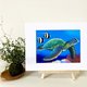 画作的颜色饱和而强烈,在湛蓝的海洋中有一只优游的海龟和两条鱼,它们朝着同一个方向前进,就像是一对好友一样展开一场未知的旅程。画面一个充满祥及喜悦的宁静画面,它们好像正在说:“我们下潜,我们呼吸,漂浮在夏天的海里。”当我们站在画前时,您会感受到可爱的角蝶鱼及绿蠵龟就像在我们眼前滑过,它们如同海洋图鉴中的照片一样,真实而深刻。