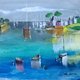 作品描绘了法国翁勒费尔小镇的港湾景色。画家以充满诗意的笔触,运用鲜亮的色彩层次将碧蓝的海面、停泊的帆船及岸边的房屋融为一体。