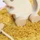 链接本体的绳子是可以拿掉的,所以当小朋友还小的时候可以不绑绳子让他推着玩,背后的尾巴做成把手的形状,可以很轻松地拿起,边改变行进的方向边游玩。(整个拿起来上下晃动时,车轮会发出卡啦卡啦的声响),等到小朋友长大会站立行走后,可以绑上绳子当做拉车来玩。使用的材料除了眼睛和鼻子的黑胡桃木以外,其余的都是产自北海道的。