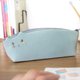 It is a cat-shaped pen case made from luxurious fabric of light mint blue suede.