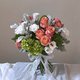 3.鲜花花材:粉橘玫瑰、白桔梗、小绿绣球、绿石竹、银叶菊。