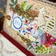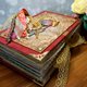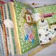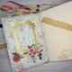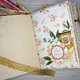 Massive tome, very tactile, with many small details in the decor. Distressed pages for writing are decorated with lace and background patterns. Faux suede binding, metallic and fabric fittings. Pockets for notes and cards from designer paper, several photo holders. A5 size (21 x 14.8 cm or 8.3 x 5.8"), 9 cm thickness.