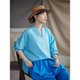 套头式的衬衫,立领与V领的结合,小立领口用对丝工艺留下花牙的边缘,透露甜美。顺着领子下来的V型,贴了一块花格子贴布,与整件衣服的晴空蓝色彩呼应着。落肩袖,显得上半身分外松弛,袖子长长的,夏天挽起来舒心利落,袖口与摆围一样止口处做了密拷,超紧致的收口工艺。顺着箱型的大身结构再看,微圆的下摆前短后长,两边都开了小衩,插兜自如。