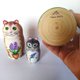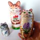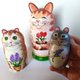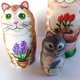 - - Matryoshka wooden cat, a set of three dolls, hand-painted with acrylics. - Orange funny cat in flowers, with a bouquet, matryoshka mouse with a flower. - Wooden doll cat and mouse. - The height of the large matryoshka-cat is 15 cm.