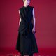 服装版型采用西装背心基础版型与衬衫领解构重塑,设计上将左侧下摆延展后,使下摆拥有丰富的垂坠效果,并于下摆处设置了衬衫领结构,增添了有弧度的立体感之外,也丰富了下摆垂坠的层次;右侧采用类西装马甲的设计,制作出两层式的设计,且透过绑带与裤耳来束出腰身增添背心的层次感,让自然垂坠的身片像似反折后的背心领般,创造出整体的不对称设计。
