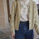 碎花衬衫搭配深蓝色修身小脚牛仔裤