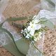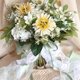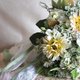 A rustic bouquet of calendula, ammi, helenium and gentiana in delicate shades of white, pale yellow and green. The stems are beautifully tied with an assortment of mint green satin ribbons and delicate lace. The accompanying groom’s boutonniere includes a selection of the same flowers wrapped with mint green satin ribbon with lace overlay.