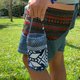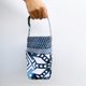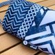 海人,男子传统服装为横条纹背心与丁字裤,而女子则为直方纹巾与裙;简朴的白底蓝条配色透过繁复手织工艺,暗藏幻变飘渺的织纹。取其传统纹路,再加入海浪、斧形饰品、编织鱼网等符号,记载达悟祖先靠着辨识星星、风向、潮流的过人智慧与胆识,航向南方打开海上贸易的历史篇章。
