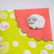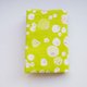 The front of this cover is made with an original design; a lime green fabric a scatter print of sheep with a few marked ones with knit patterns on their bodies. The inside is a plain coral pink coloured fabric similar to that used for the scalloped corner. The cover is mostly machine-sewn with the corner and sheep motif is hand-appliqued.